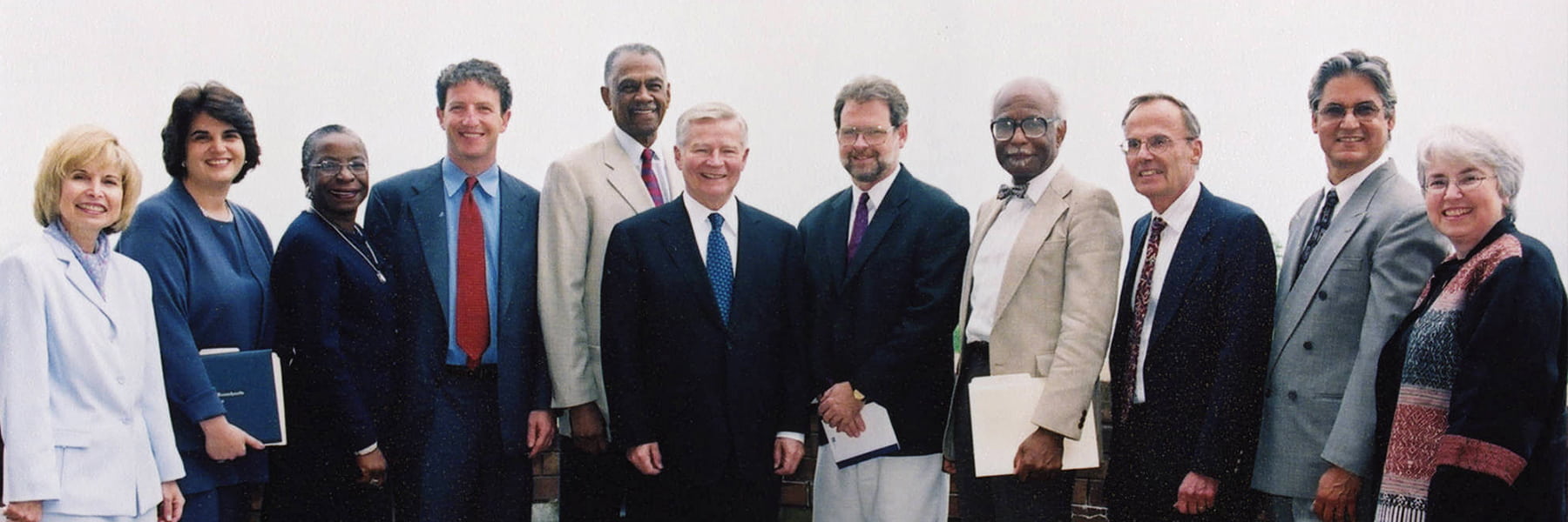 Pictured above: William Bulger, president of the University of Massachusetts system from 1996-2003 (center), with speakers at the 2001 Gerontology Commencement. Special awards were presented to gerontology graduates at the commencement ceremony. Left to right: Secretary of the Massachusetts Executive Office of Elder Affairs Lillian Glickman; Professor of Gerontology Nina Silverstein; Commissioner of Elderly Affairs for the City of Boston Joyce Williams; Dr. Thomas Perls, former Secretary of the Massachusetts Office of Elder Affairs; Franklin Ollivierre; President William Bulger; Gerontology Professor Jeffrey Burr; Provost Winston Langley; Gerontology Professor Frank Caro; College of Public and Community Service Dean Ismael Ramirez Soto; and Ellen Bruce, policy director for the Gerontology Institute.