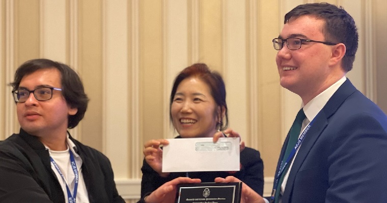 Presenting the award to John Patrick Moylan (right) are his senior thesis advisor, UMass Boston Assistant Professor of Sociology Christopher Contreras (left), and the Chair of the ACJS Security & Crime Prevention Section, Associate Professor Hyeyoung Lim (middle) of the University of Alabama at Birmingham.